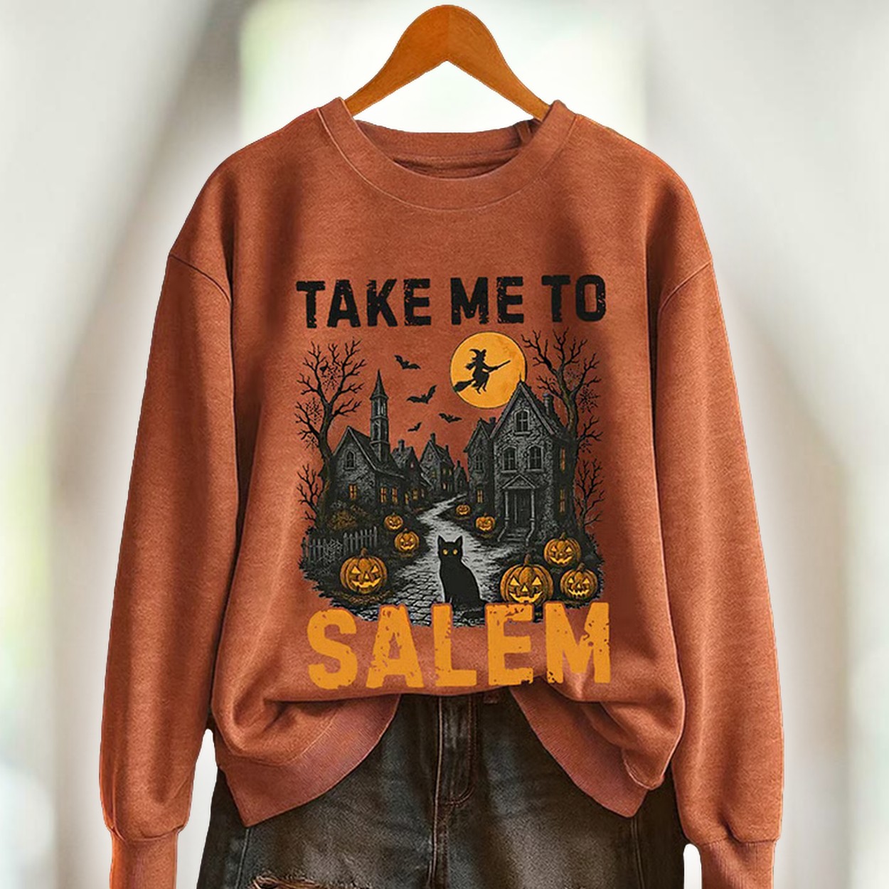 Journey to Spooky Salem with the Vintage Halloween Take Me To Salem Print Sweatshirt