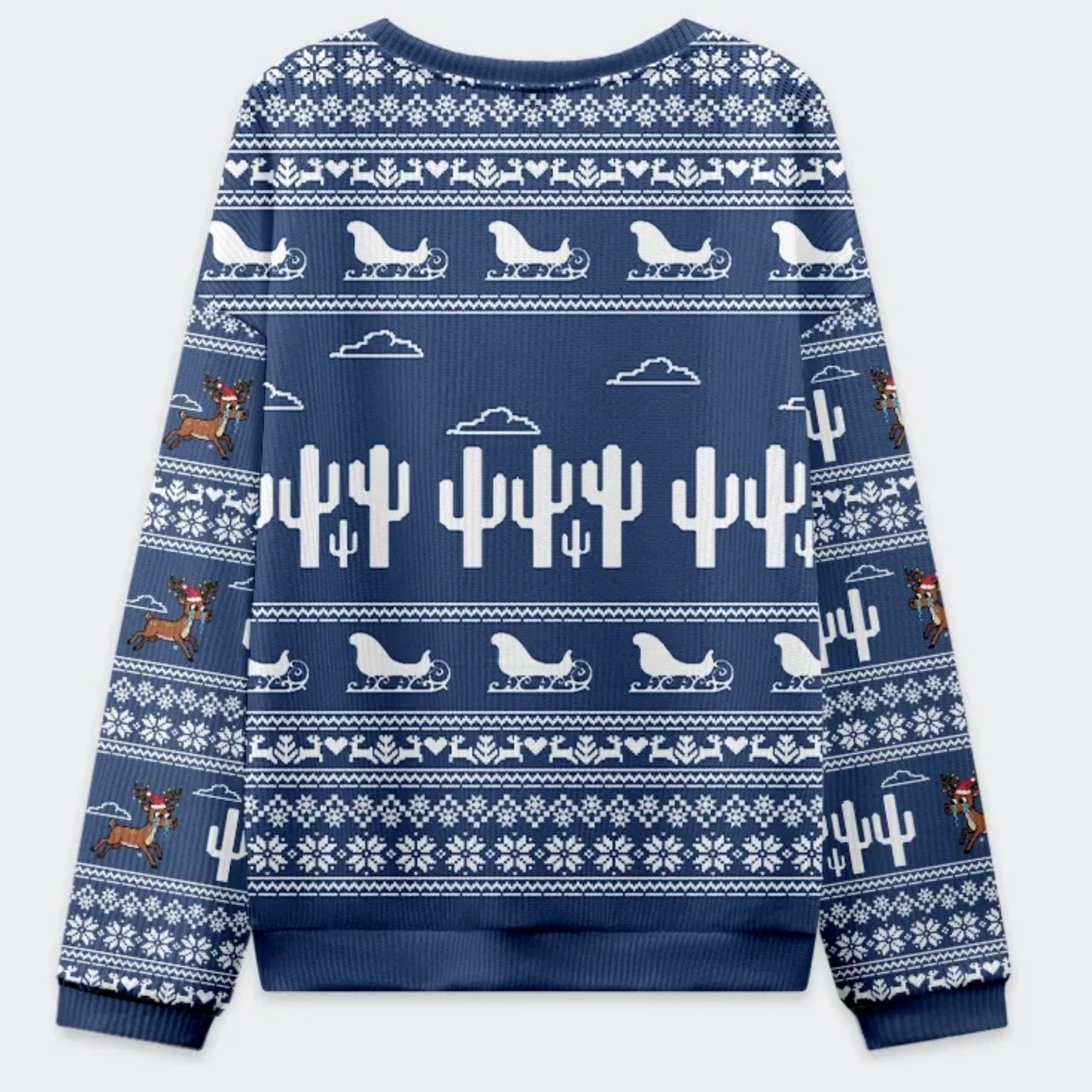 The front of the sweater features a large, sad-looking pixelated elk wearing a Santa hat and a string of Christmas lights on its antlers. Teary-eyed, it stands in a desert-like landscape of cacti under a gray sky, perfectly capturing the feeling of holiday disappointment. Above this scene is the relatable message, “ERROR 404: CHRISTMAS NOT FOUND.” The classic fair isle pattern is updated with a cool blue and white palette, complete with snowflakes and reindeer-pulled sleighs. Made from soft, durable polyester, this sweater provides comfortable warmth without the itchiness of traditional wool. It’s a great conversation starter and the ultimate outfit for those who appreciate tech-savvy humor and a healthy dose of holiday reality.