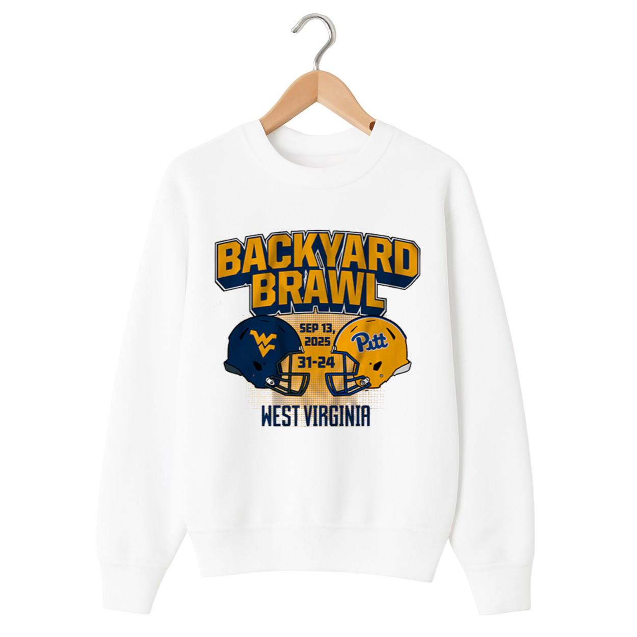 Commemorate a historic victory in one of college football’s most storied rivalries with the West Virginia Football Backyard Brawl Champs Shirt. This exclusive design captures the essence of the Mountaineers’ hard-fought win over their archrivals, the Pitt Panthers, on September 13, 2025. The bold, classic design features two football helmets—one for each team—with the final score of 31-24 proudly displayed in between. Above the helmets, the iconic “BACKYARD BRAWL” text stands out, with “WEST VIRGINIA” printed below, leaving no doubt who came out on top. It’s the perfect way to remember the dramatic comeback and overtime triumph that secured bragging rights for the Mountaineers.