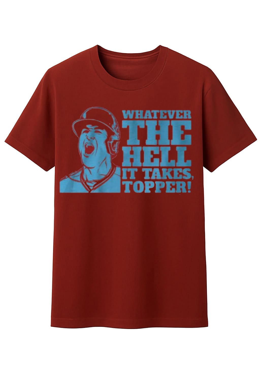 The design features a bold, two-tone graphic of an intense baseball player shouting his absolute maximum, embodying the famous quote from ML. The text, “WHATEVER THE HELL IT TAKES, TOPPER!” is printed in a large, dynamic font right next to the player’s image, making a clear, unmistakable statement. The deep, rich color of the shirt provides a striking backdrop for the bright blue graphic. Made from lightweight, breathable polyester, this shirt offers a soft, comfortable feel that moves with you, whether you’re working out, yelling from the stands, or just hanging out.