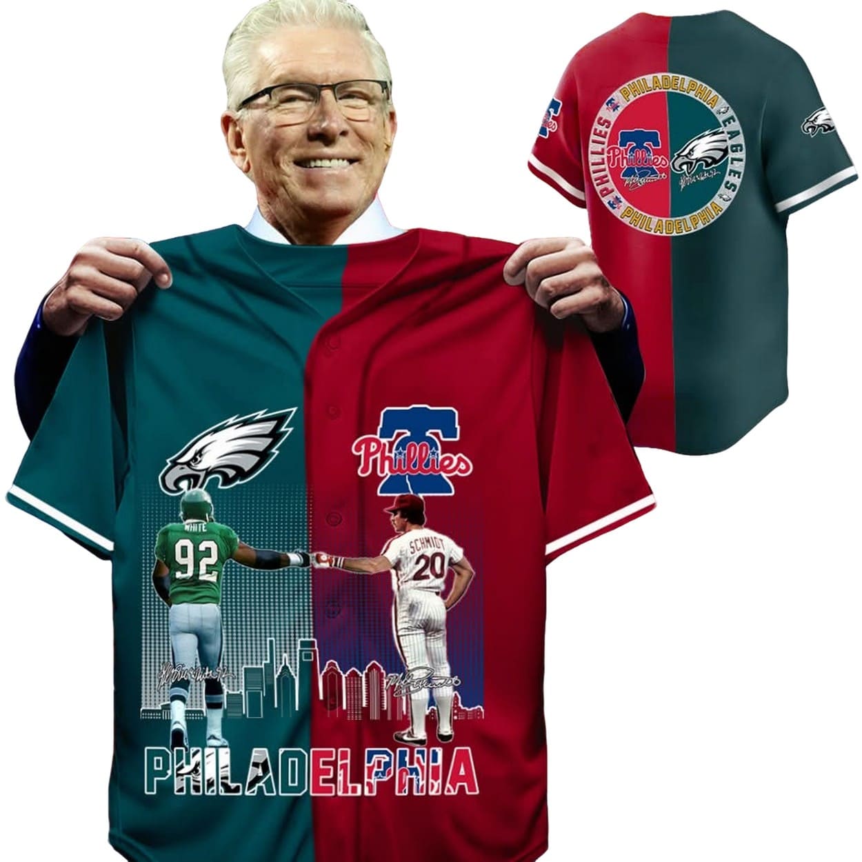 Wear your Philadelphia pride with the “White Eagles Schmidt Phillies Baseball Jersey“! This split-design jersey showcases the red Phillies side with Mike Schmidt’s #20 and the green Eagles side with Reggie White’s #92, tied together by a striking “PHILADELPHIA” graphic. Perfect for game days or casual outings, it’s a must-have for any Philly fan.