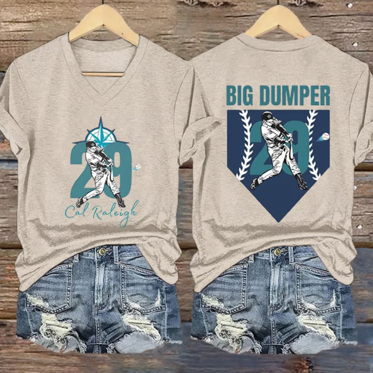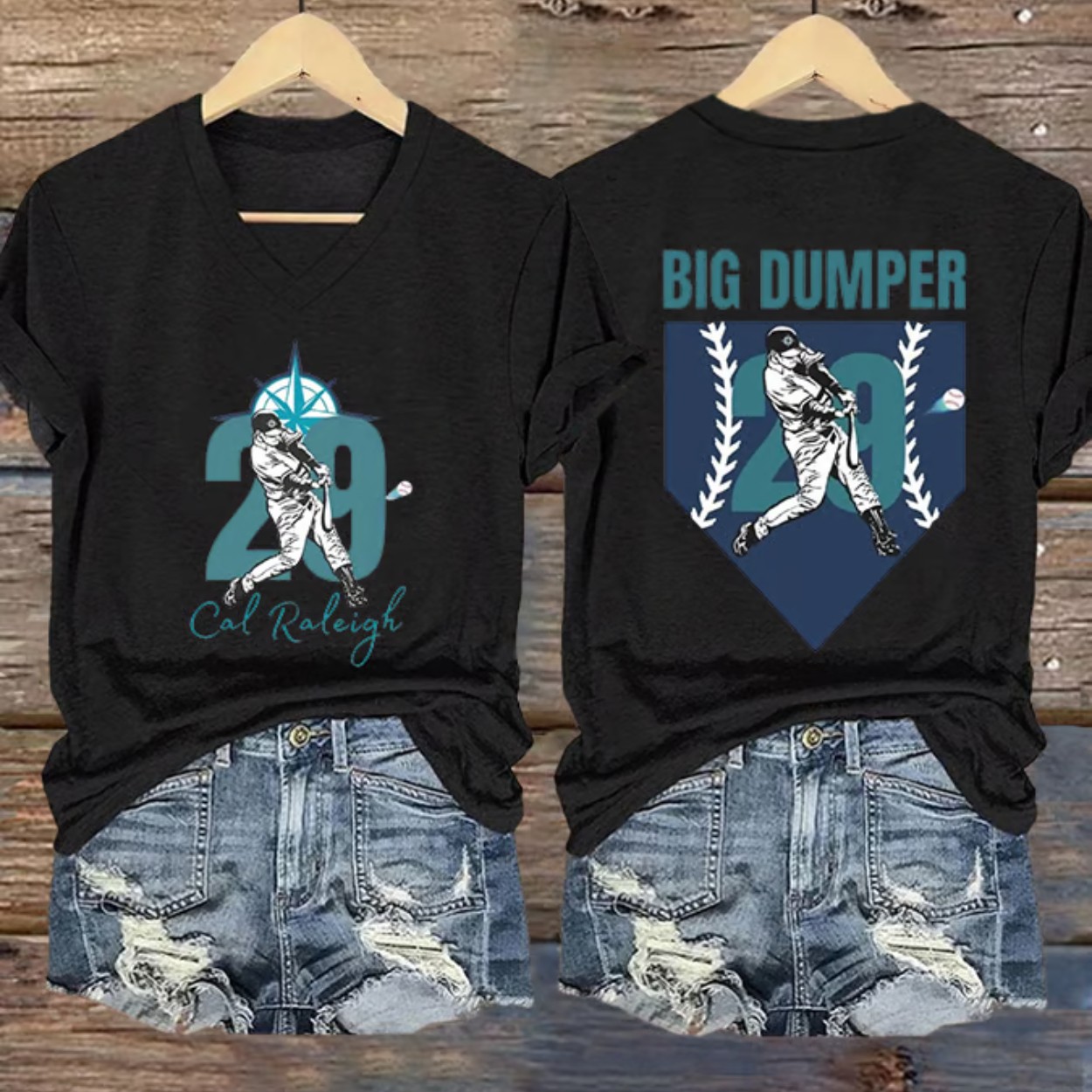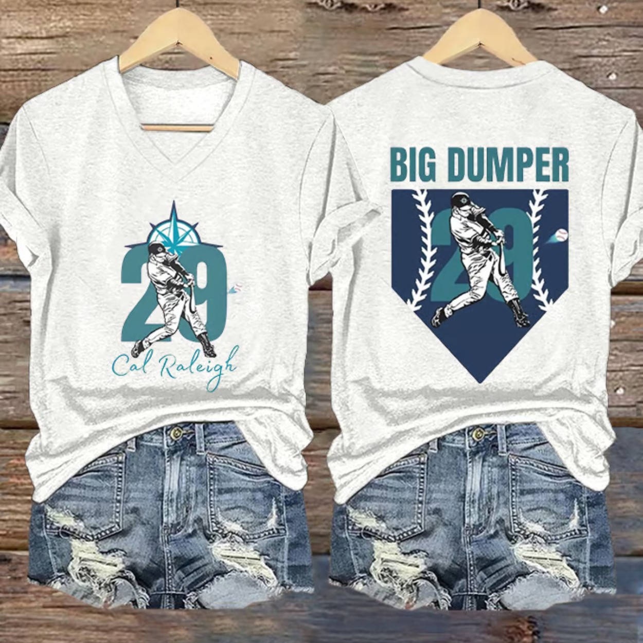 The front features a bold illustration of Cal Raleigh in action, jersey number 29, framed by a compass logo and his signature in teal. The back showcases a diamond-shaped design with “BIG DUMPER” above another dynamic swing graphic, complete with the number 29 and a baseball trail. This chic, sporty look celebrates his 2025 Home Run Derby triumph with flair.
