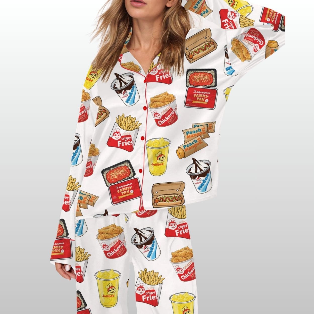 Indulge in your love for the “joy of eating” with the Women’s Jollibee Fast Food Silky Satin Pajama Set. This playful and vibrant loungewear collection features an all-over print of your favorite menu items, from the iconic Chickenjoy and Jolly Spaghetti to the Peach Mango Pie.