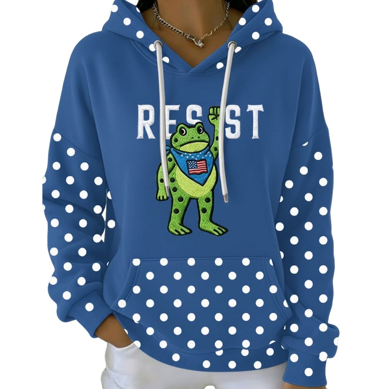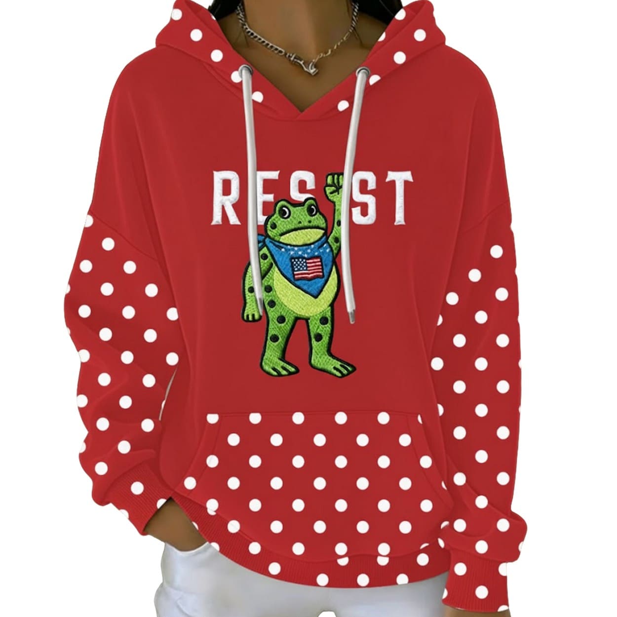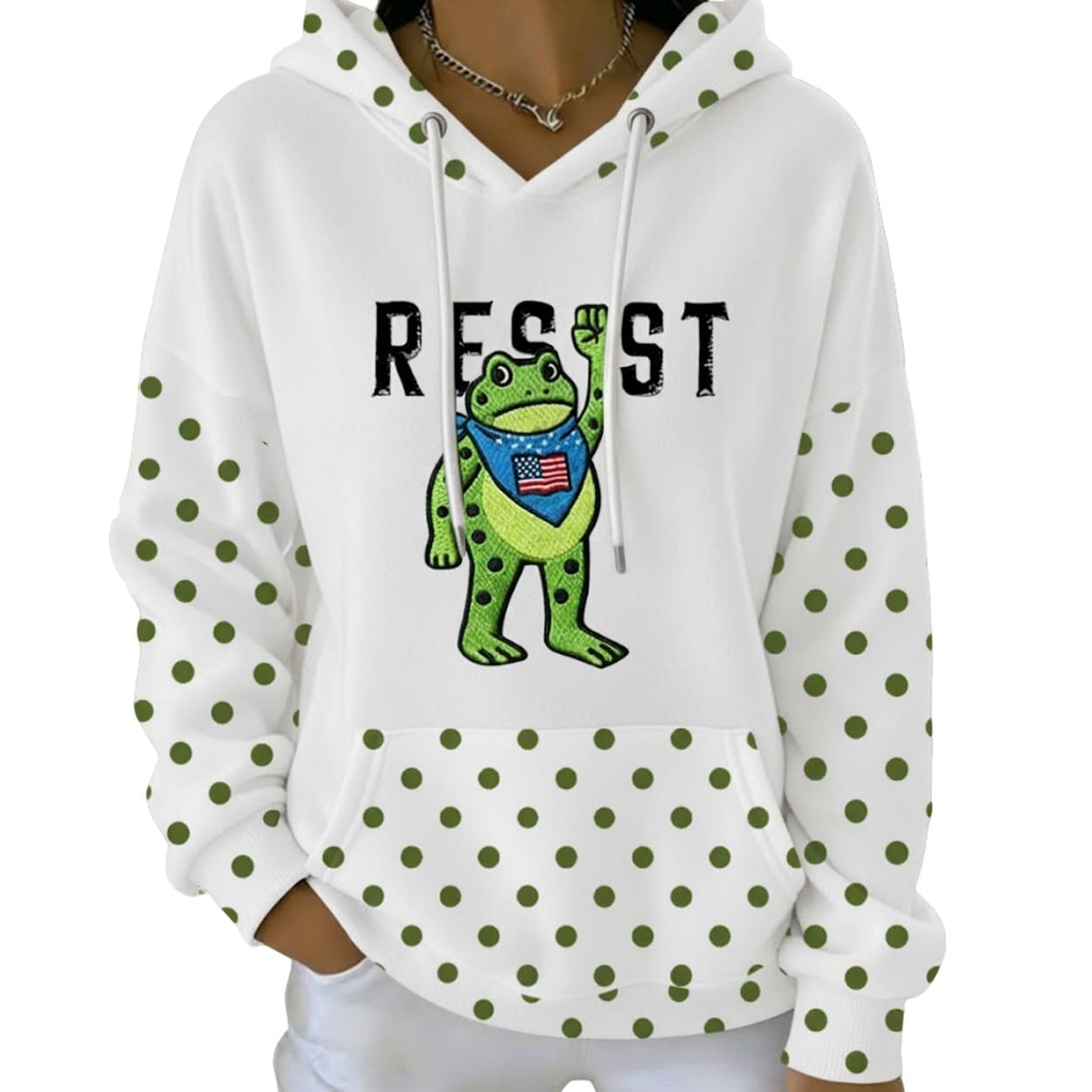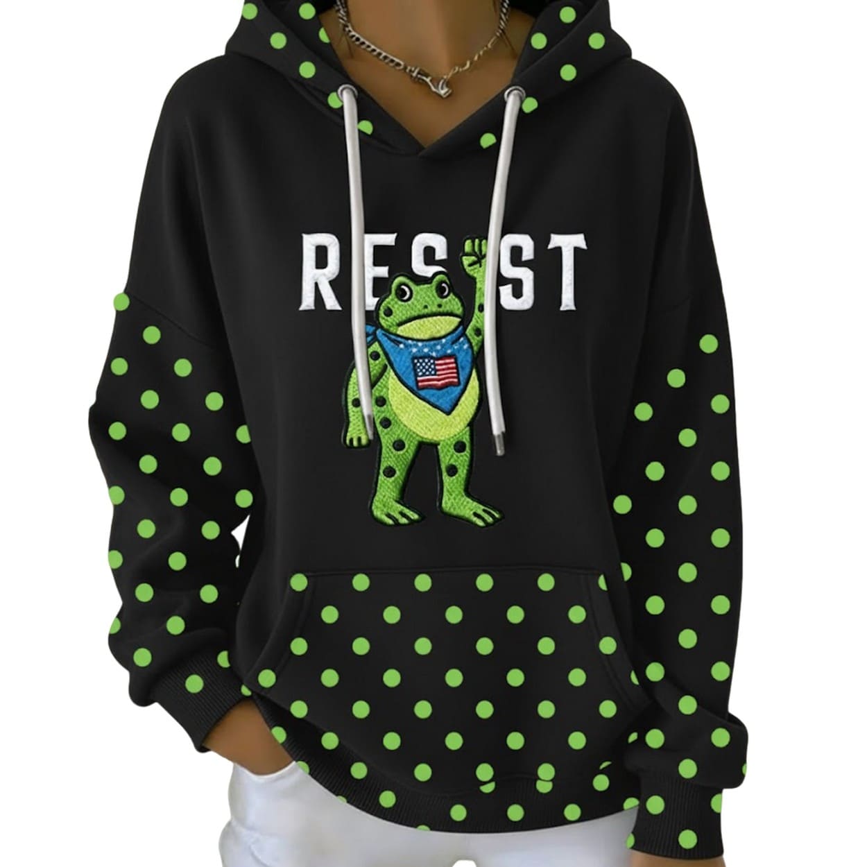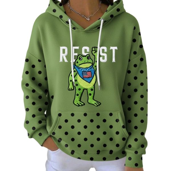 | Design Feature | Green hoodie with black polka dots, featuring the Resist Frog wearing an American flag bandana and a “RESIST” slogan. |