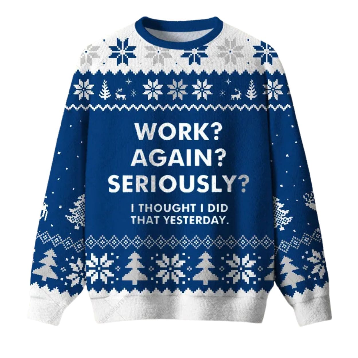 | Design Feature | Full-coverage “ugly sweater” print featuring the relatable “WORK? AGAIN? SERIOUSLY?” slogan and festive snowflake/tree patterns. |