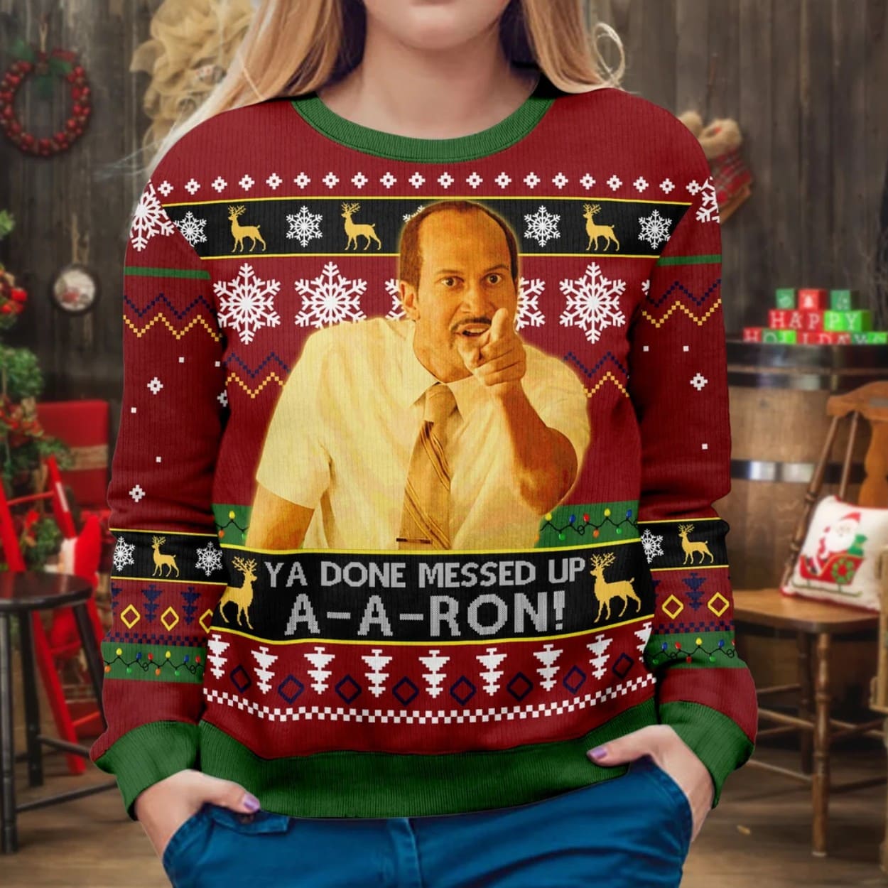 Get ready to bring the laughs and an iconic pop culture moment to your holiday festivities with the Key & Peele ‘Ya Done Messed Up Aaron’ Ugly Christmas Sweater! This hilarious sweater is a perfect blend of festive cheer and legendary comedy, guaranteed to be the star of any ugly sweater party or holiday gathering.