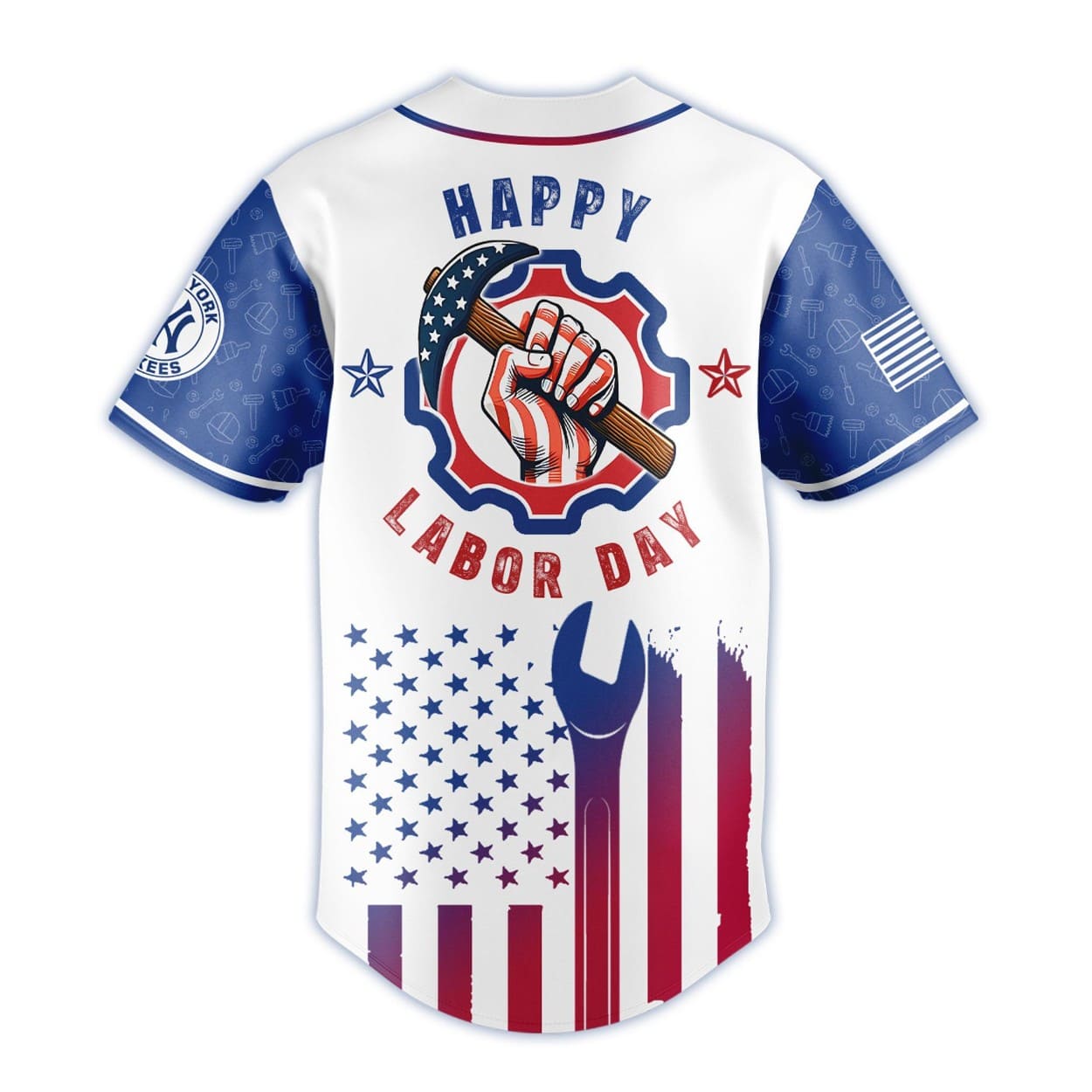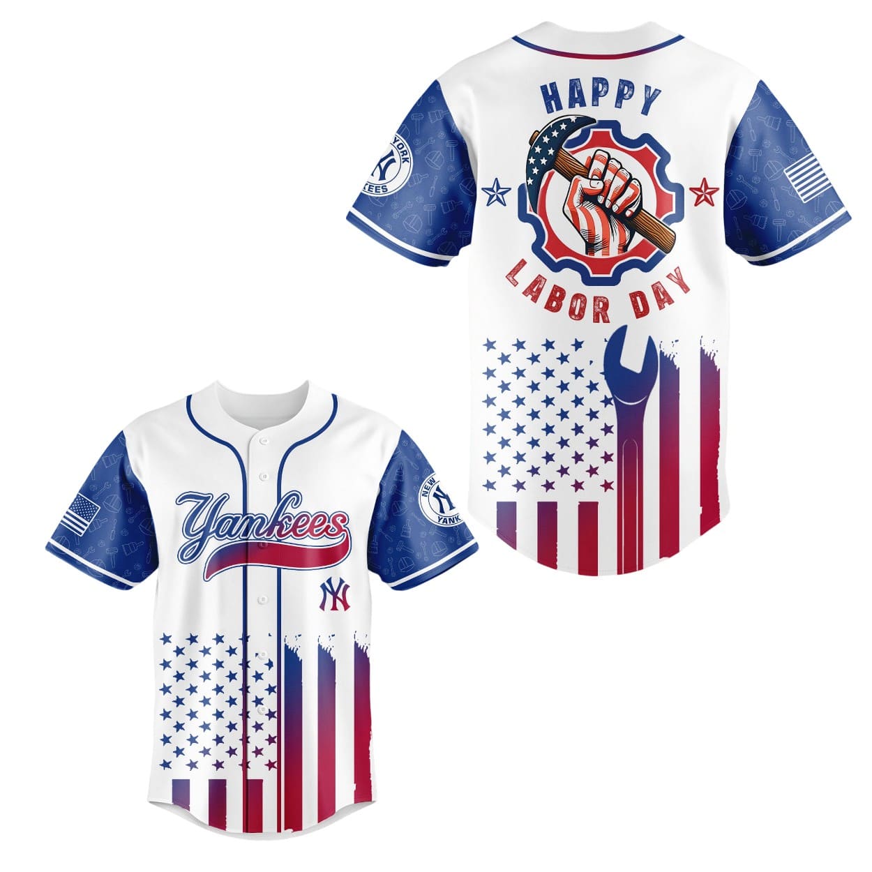 Design Details: Features bold American flag-inspired graphics, “Yankees” script on the front, and “Happy Labor Day” with a wrench and gear motif on the back — a nod to the working spirit