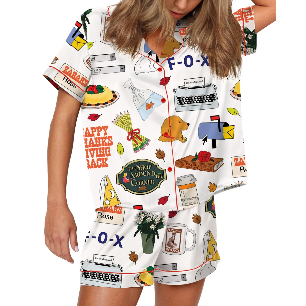 This two-piece set is crafted from a delightful blend of polyester and spandex, offering a buttery-soft, silky feel against your skin. You’ll spot whimsical illustrations of typewriters, email notifications, cups of coffee, stacks of books, a yellow dog, autumn leaves, and even the memorable “The Shop Around the Corner” sign.