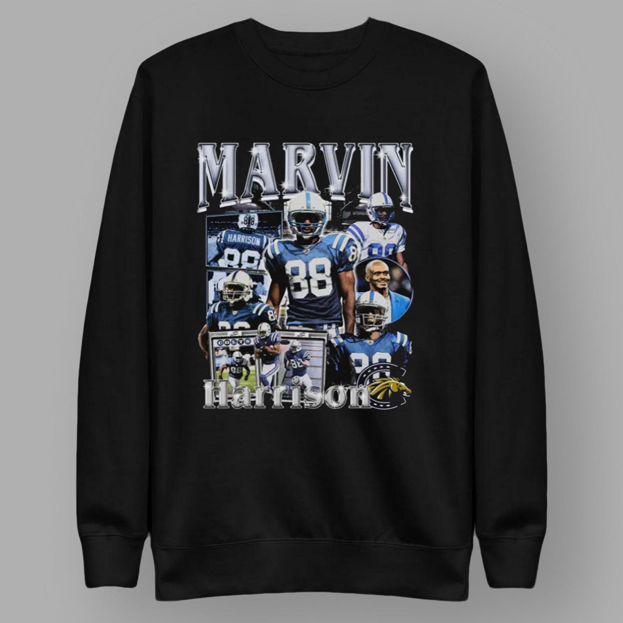 - This striking black tee showcases a bold design featuring Marvin Harrison’s iconic Colts imagery, including his jersey number 88, action shots, and a vintage football vibe.